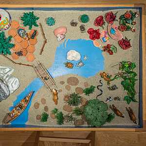 Was beim Sandspiel so leicht und spielerisch aussieht, hat eine grosse Tiefenwirkung. Gehalten im freien und geschützten Raum der therapeutischen Beziehung gestalten Kinder oder Erwachsene ein Bild im Sand mit Hilfe von Wasser, manchmal auch Feuer in der Form von Kerzen, Miniaturfiguren, sowie Objekten aus allen Lebensbereichen.